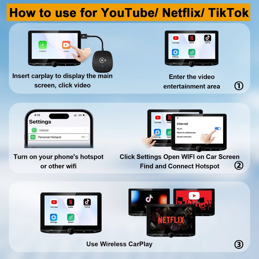 This guide provides step-by-step instructions on how to use a Wireless CarPlay adapter (like the device shown) to stream video from apps such as YouTube, Netflix, and TikTok directly onto your car's main display.