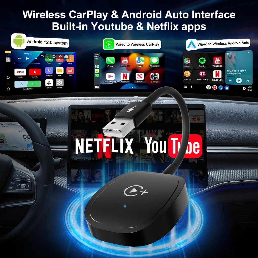 The essential upgrade for your vehicle! This compact, powerful smart adapter provides a Wireless Video CarPlay and Android Auto interface, instantly converting your wired system for seamless, cable-free connection. It is compatible with more than 98% of Wired Apple CarPlay/Android Auto cars (including popular brands like BMW, Mercedes, Ford, Audi, and more).